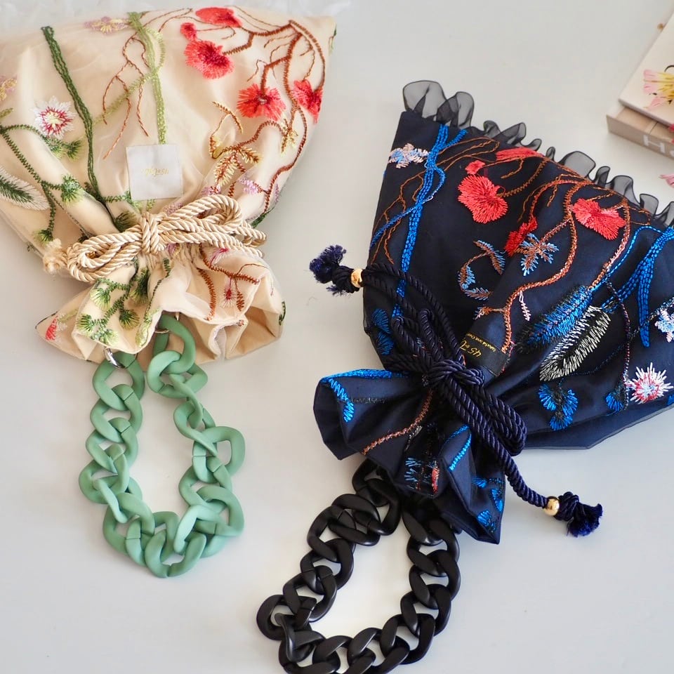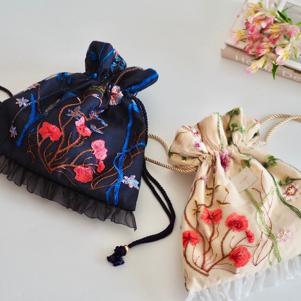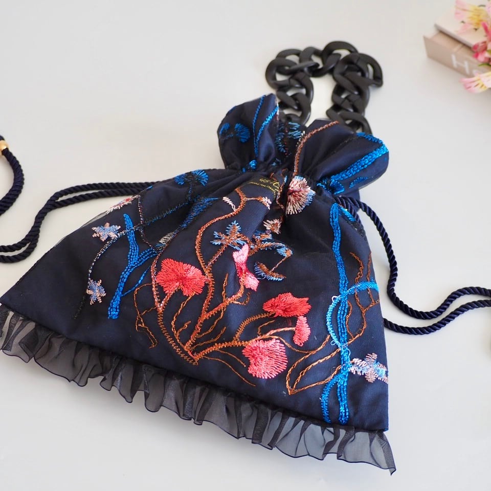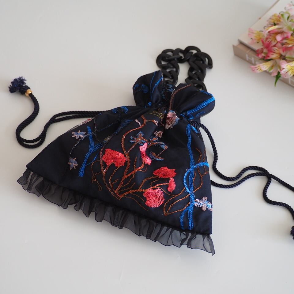 お花の刺繍が施されたチュールレースの生地を使った巾着バッグ 。