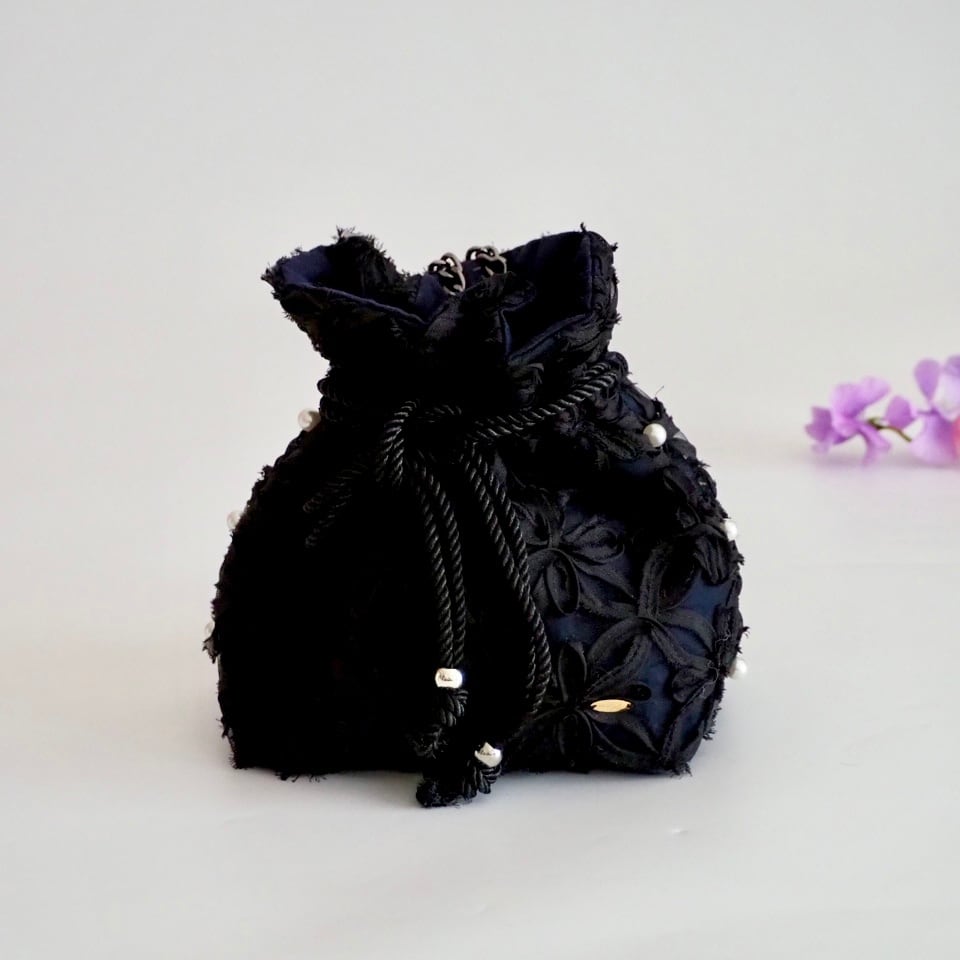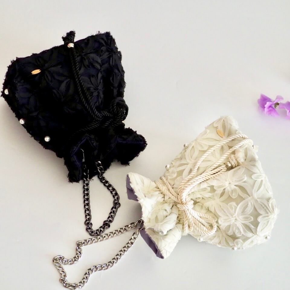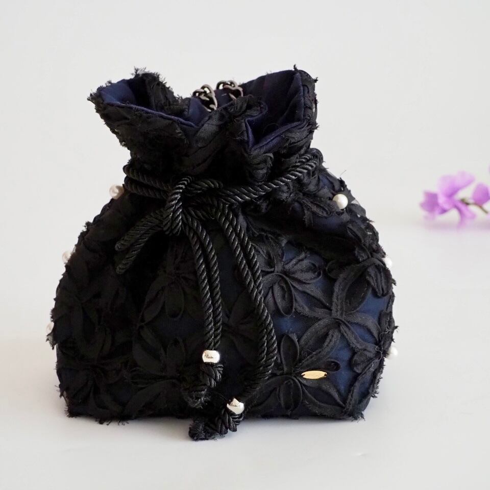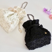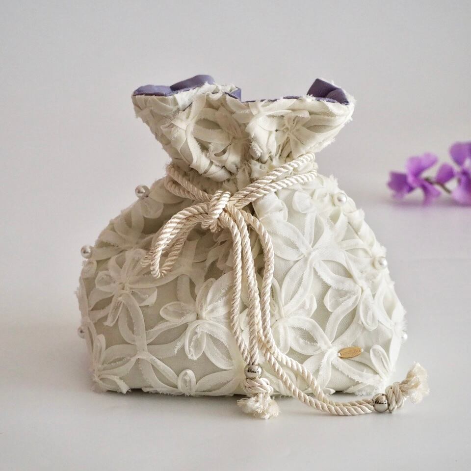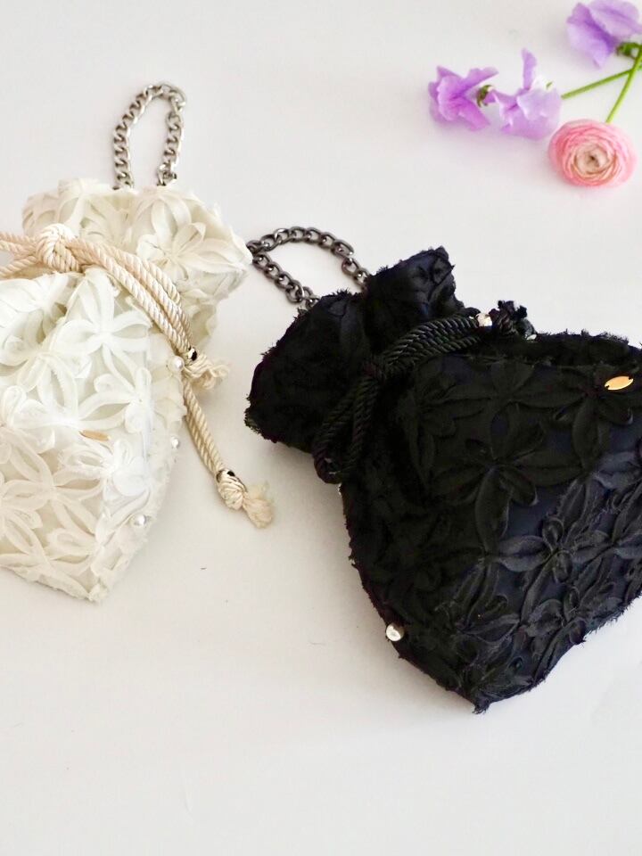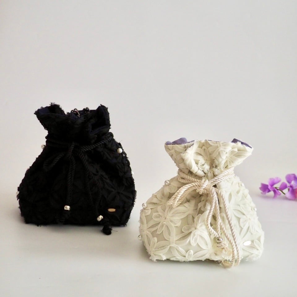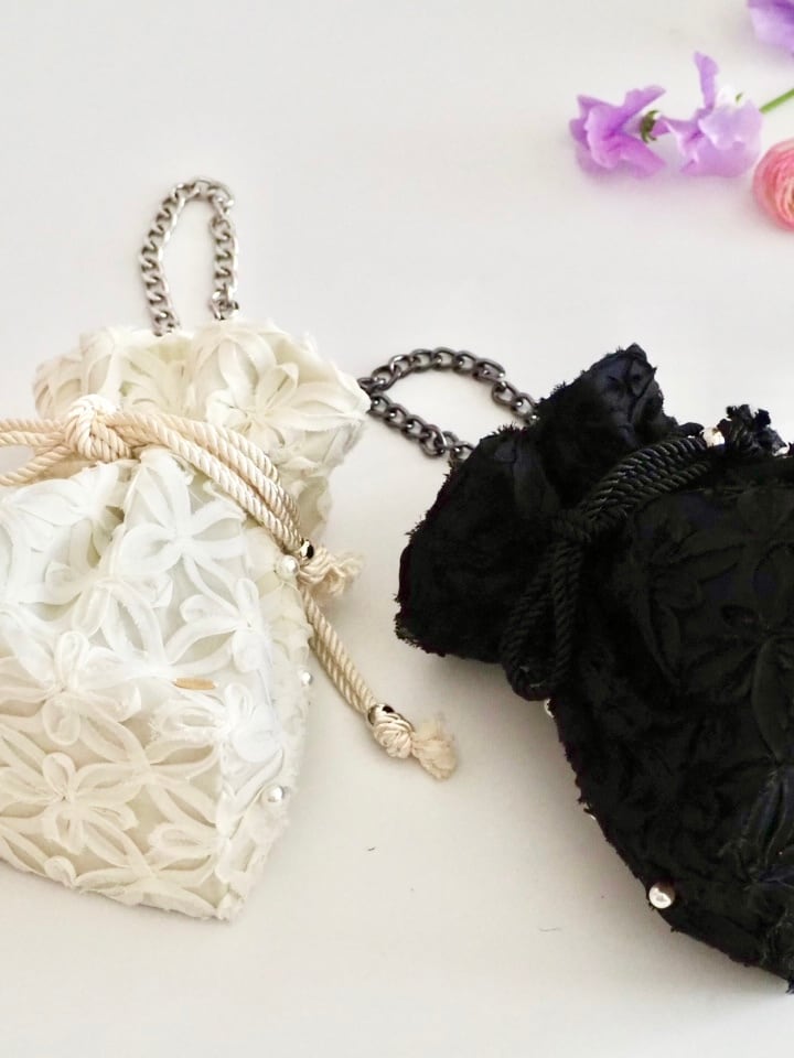 繊細でエレガントなレースとチュールの巾着バッグ。