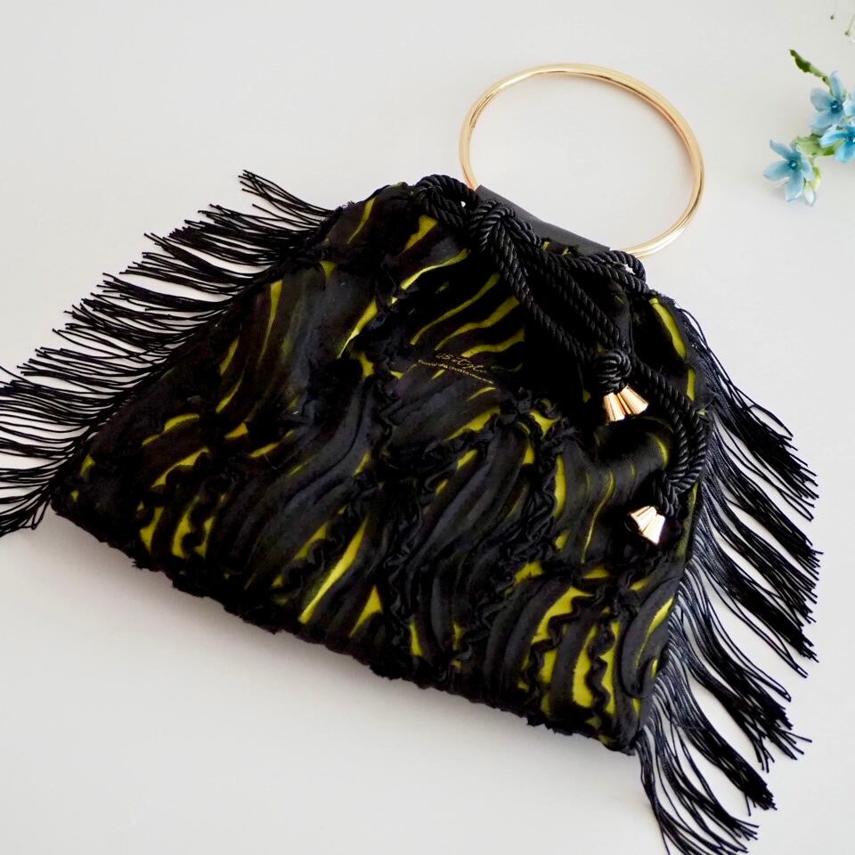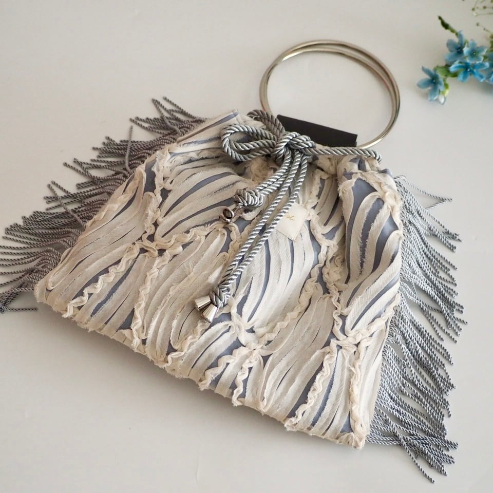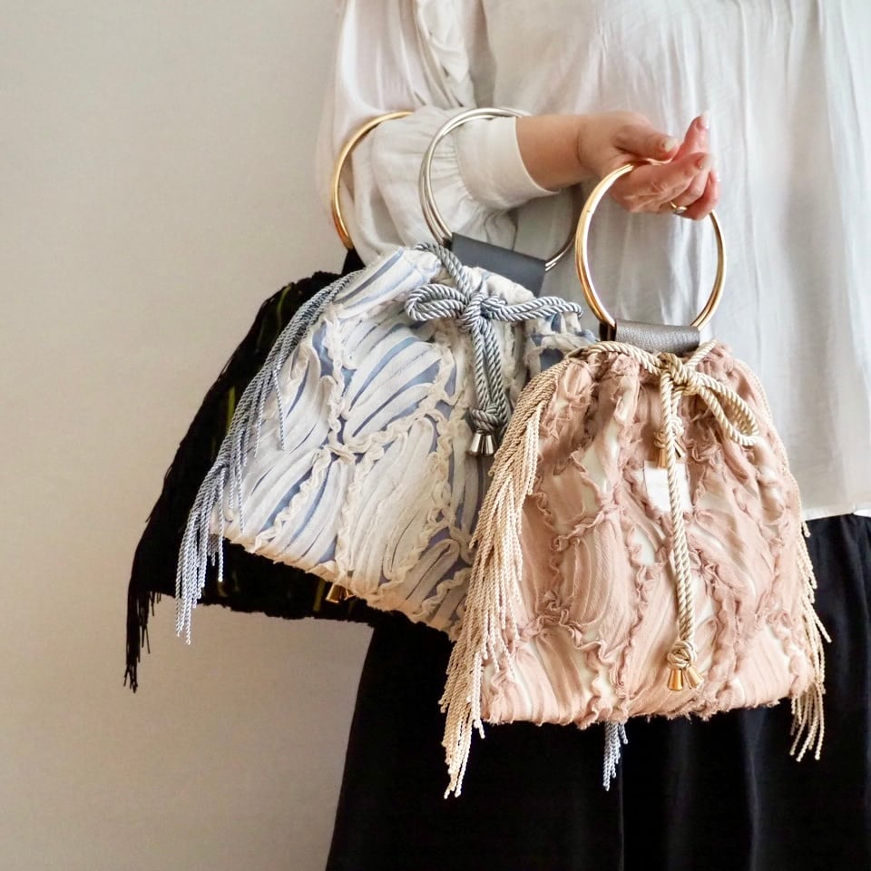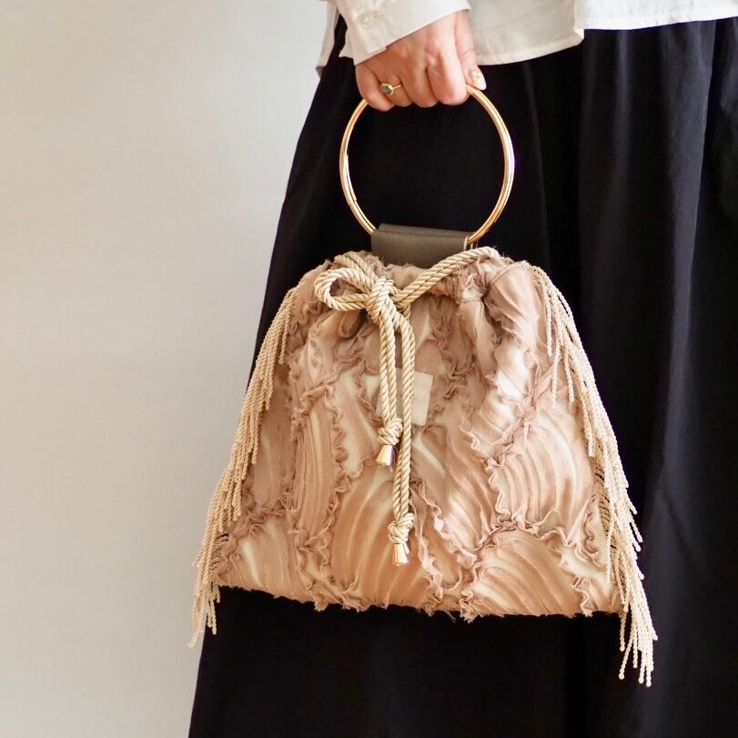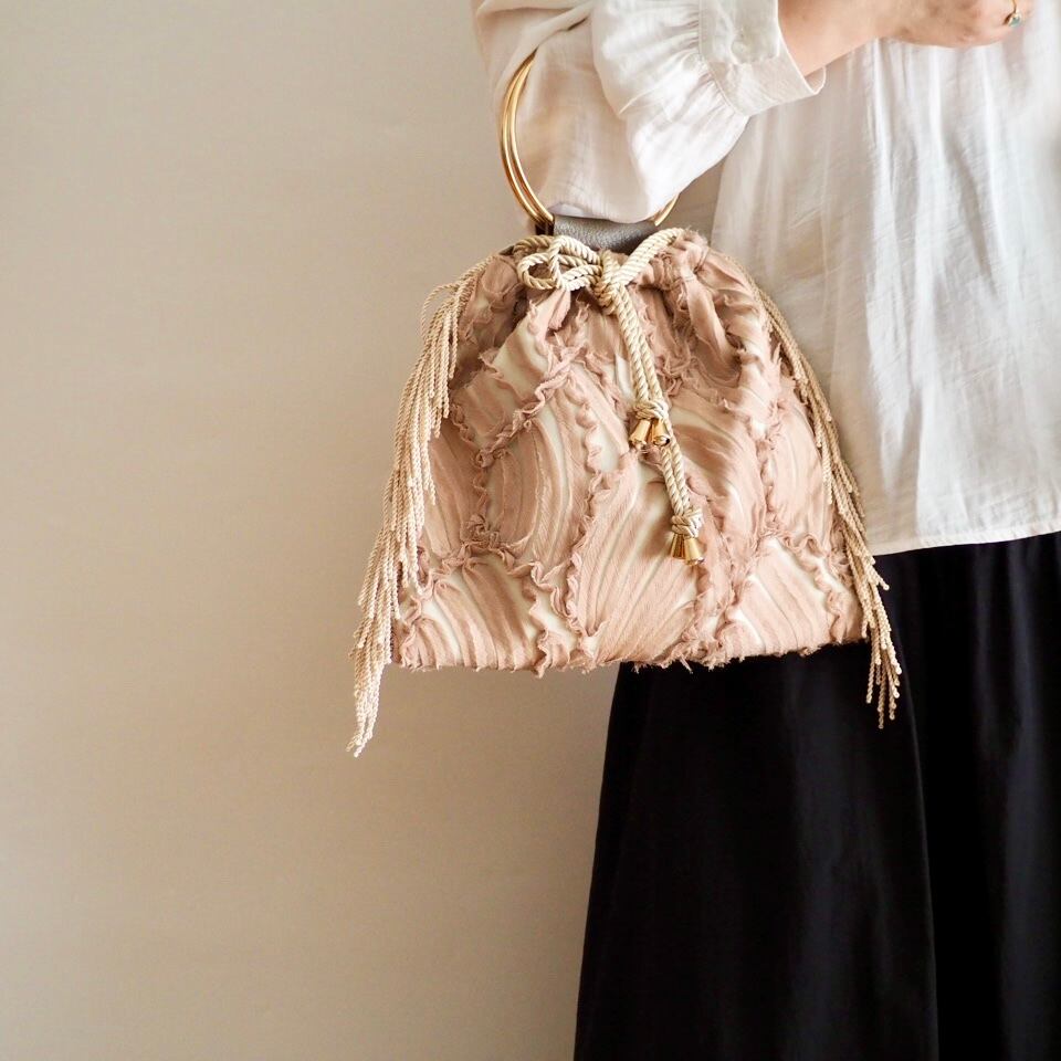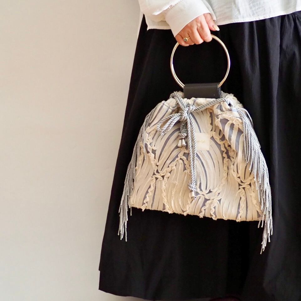 レース模様がとってもエレガントな生地のリングハンドルのバッグ。