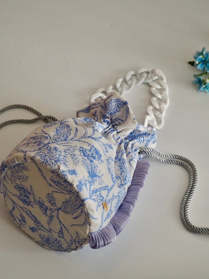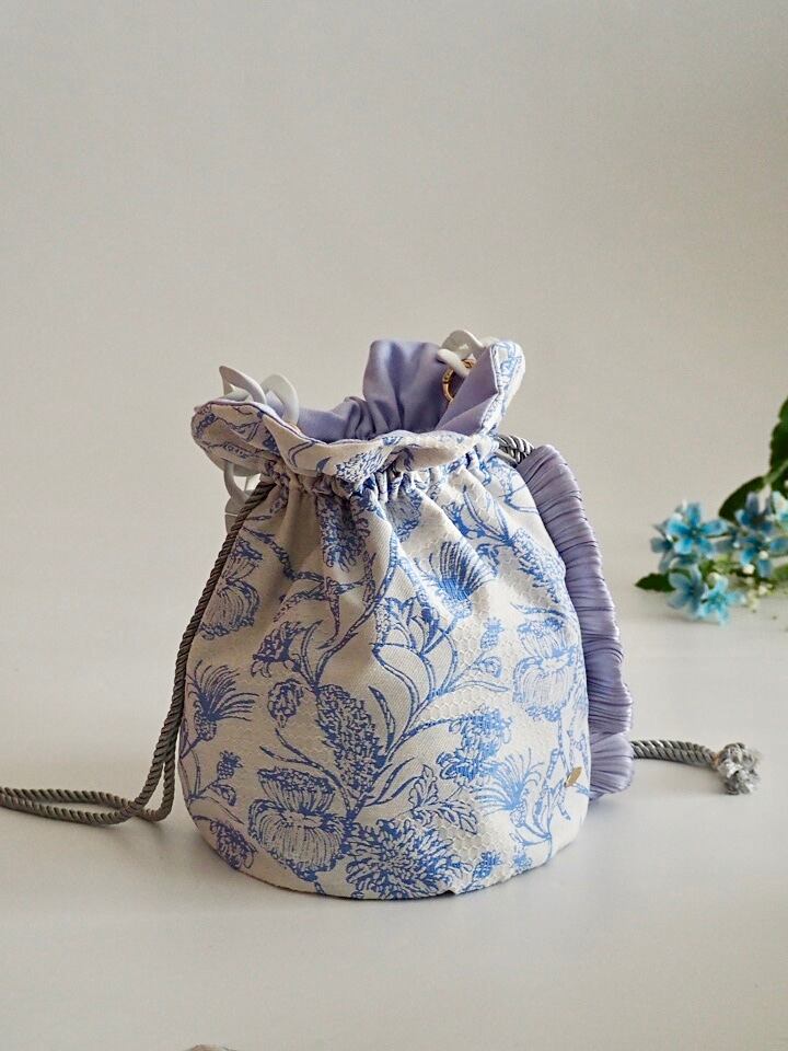 ブルーの花柄がエレガントで美しい生地で、丸底の巾着バッグを作りました。