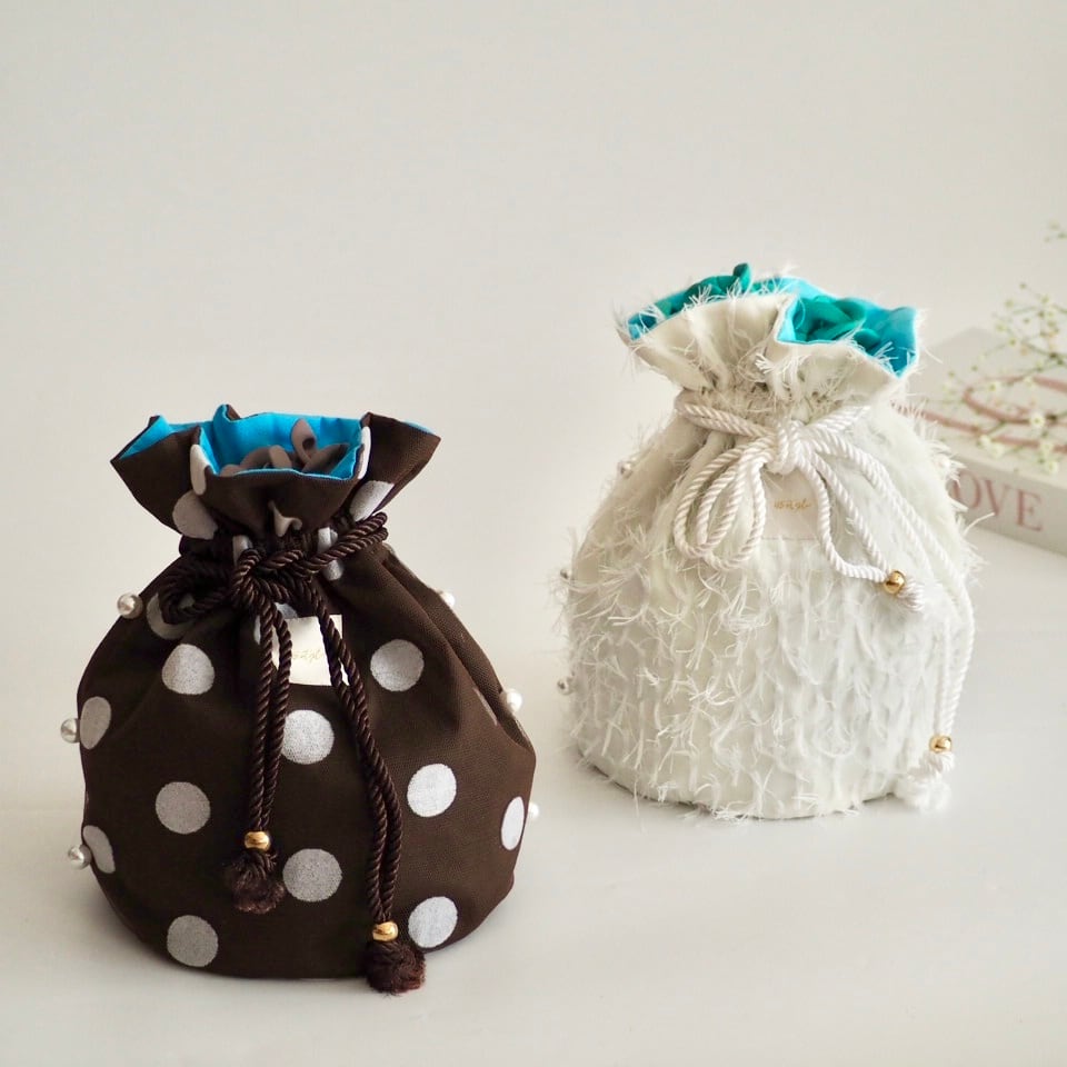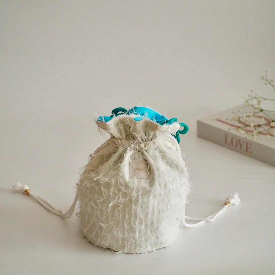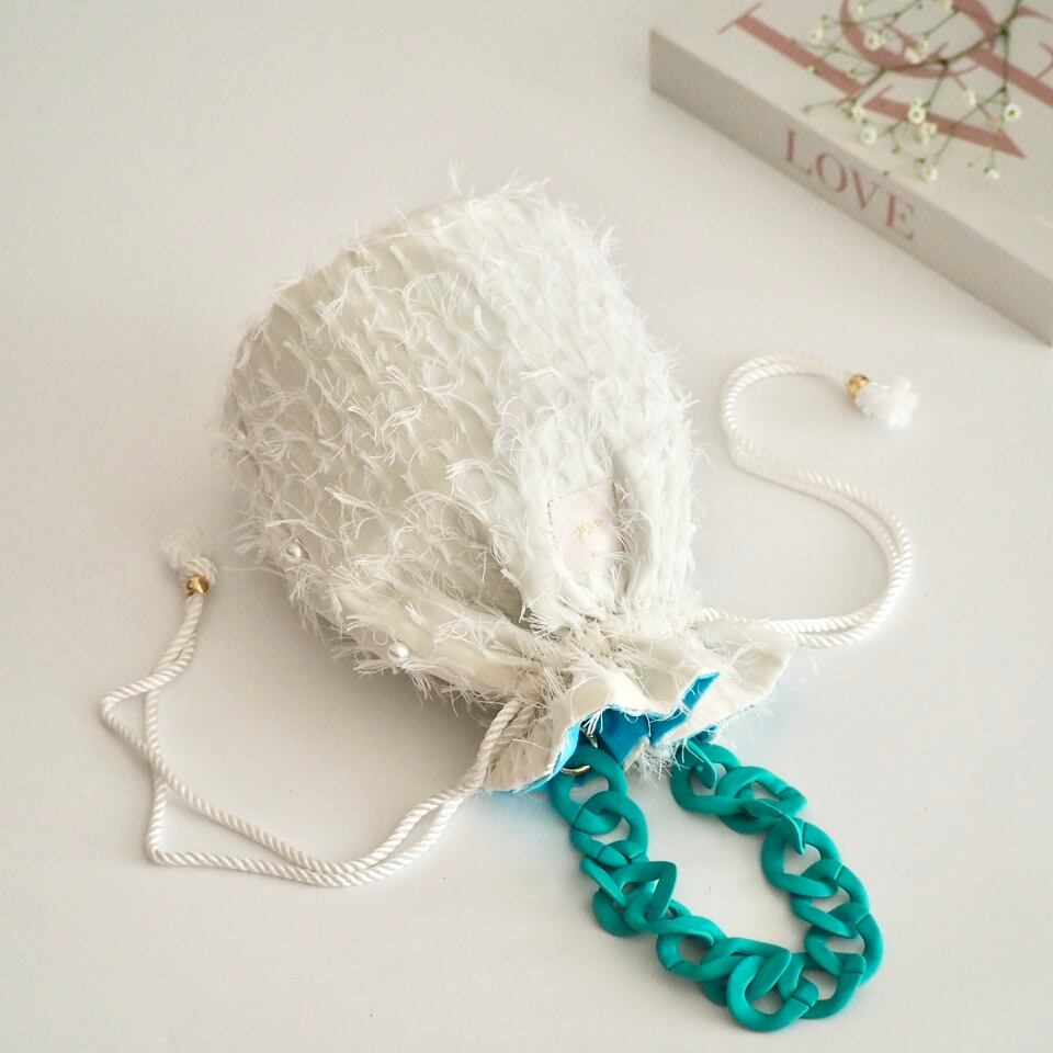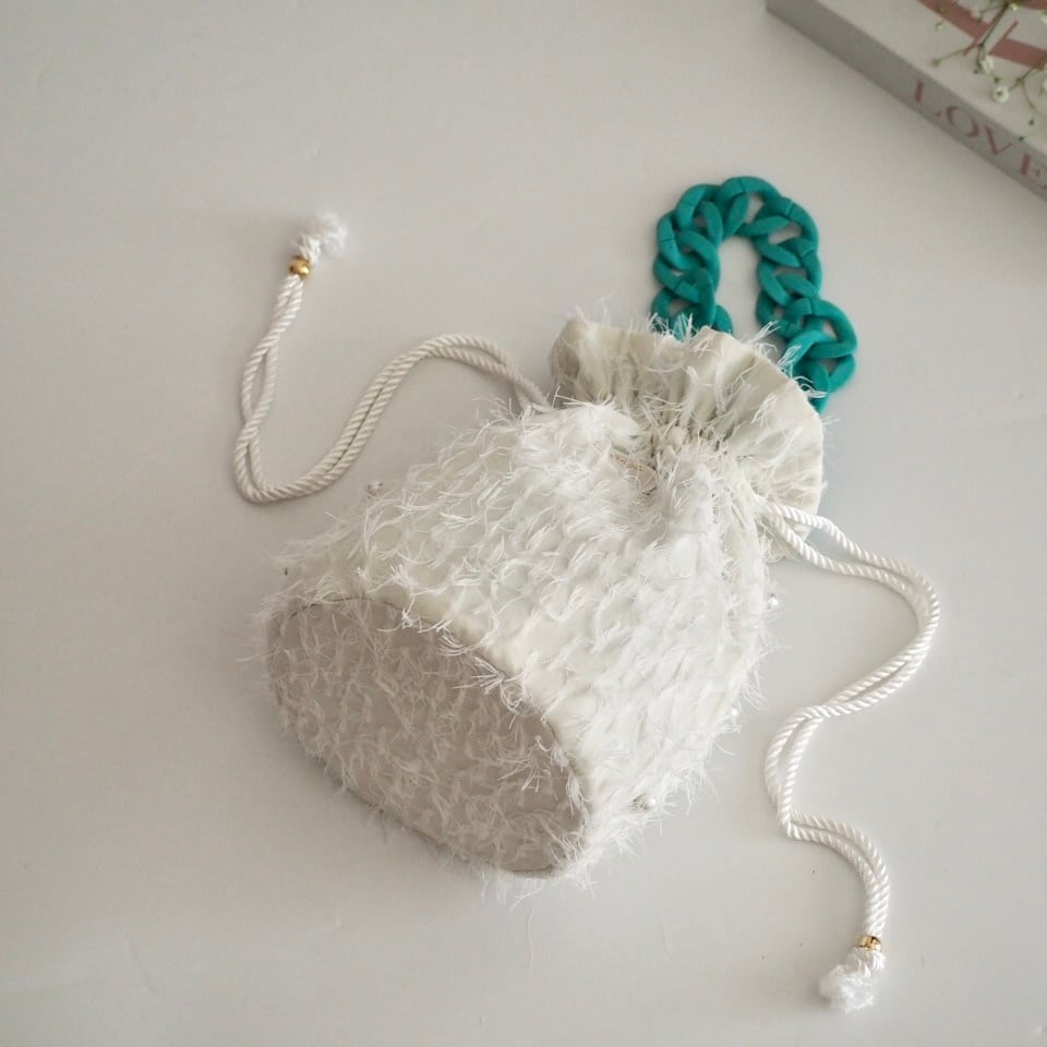 ホワイトフリンジ丸底巾着バッグ