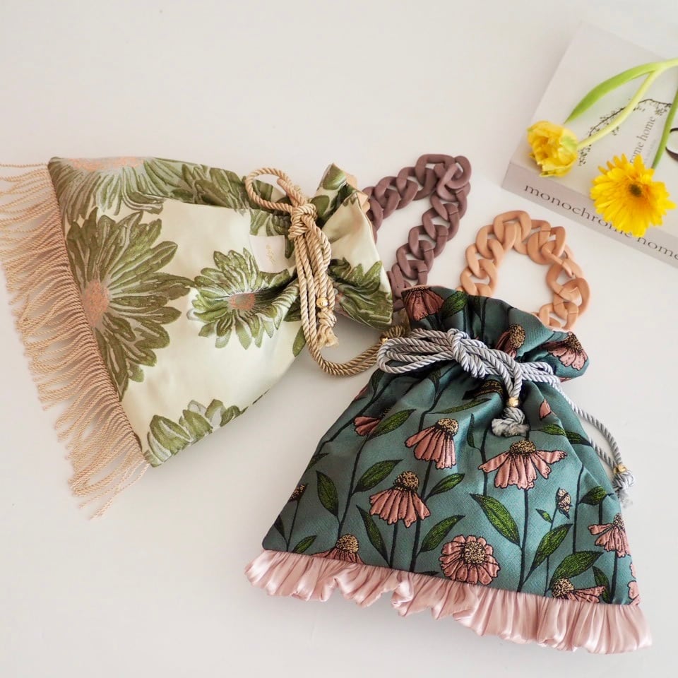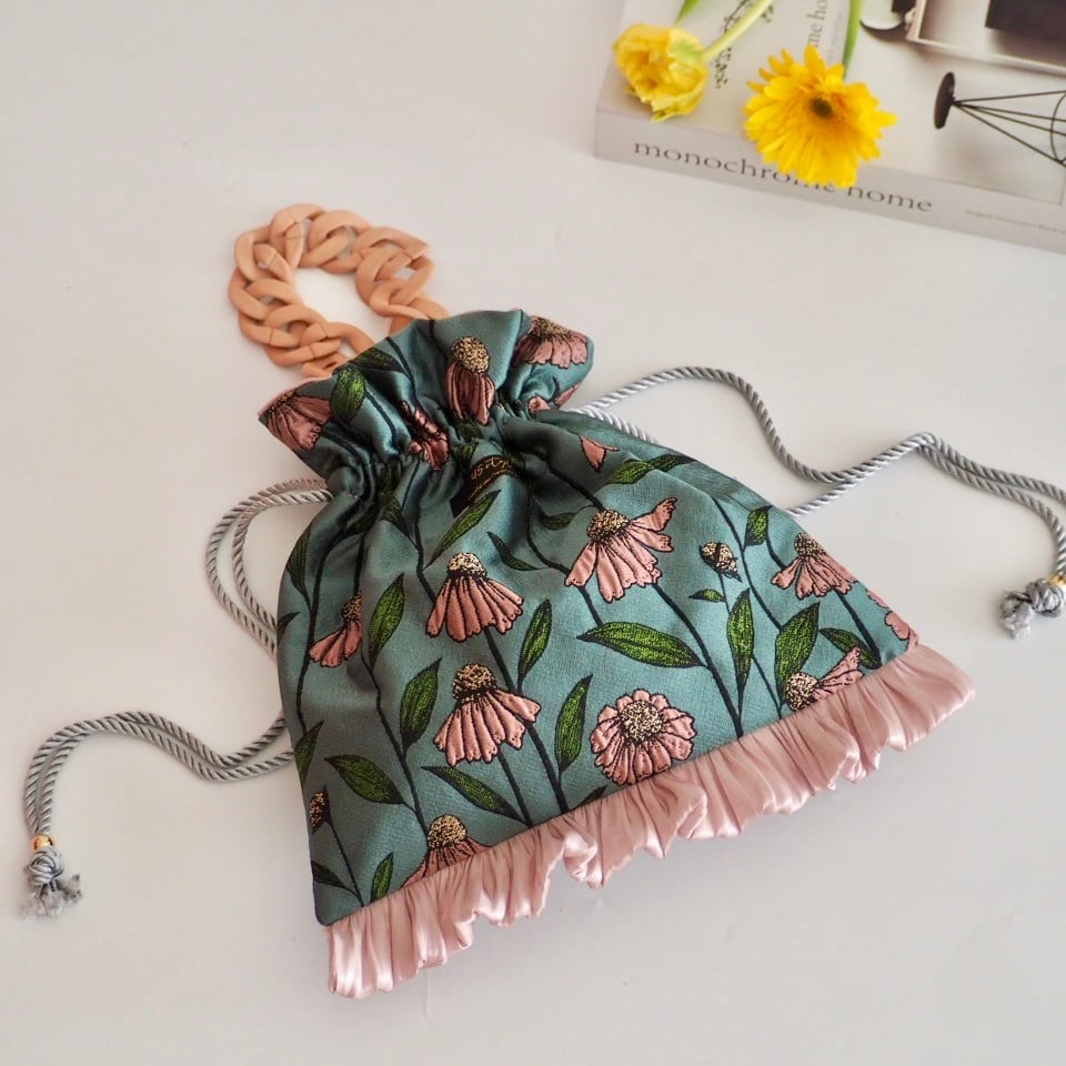 グリーン地にピンクの花柄が目を引くジャガード巾着バッグ。