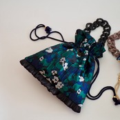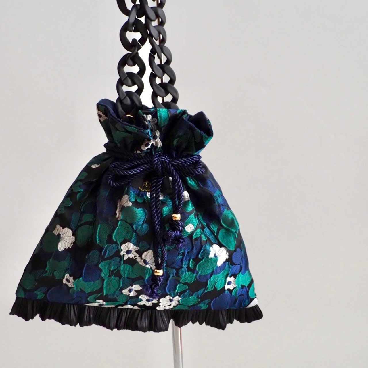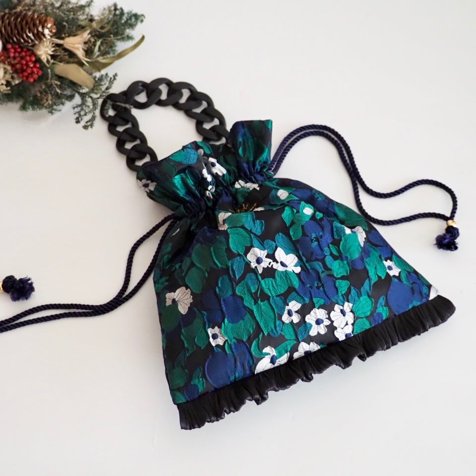 ネイビー地にホワイトの小花柄が目を引くジャガード生地の巾着バッグ。